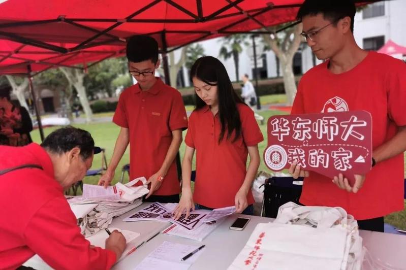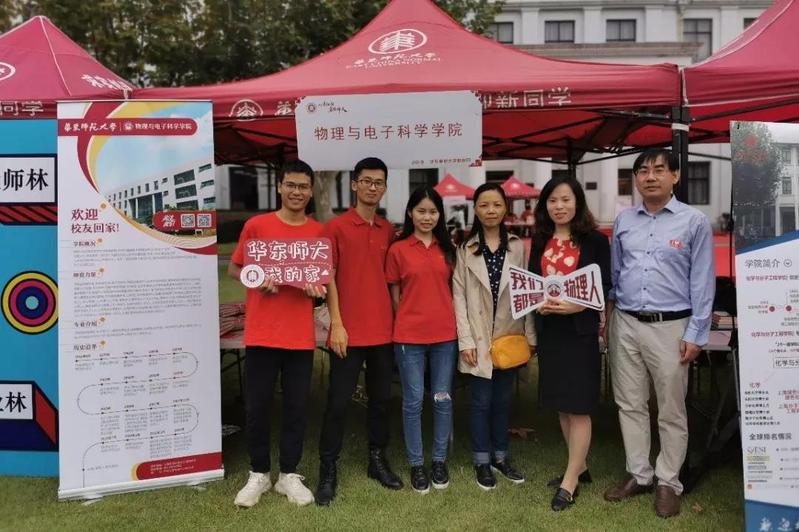 为迎接校友返校,学院准备了印有物理与电子科学学院LOGO的帆布袋、书签、宣传页等纪念礼,同时制作了 “欢迎校友回家” “我们都是物理人”“华东师大我的家” 等海报和标语牌, 学院师生志愿者积极投入到会务、接待等各项工作中,在文史楼前的大草坪设立服务摊位,欢迎校友回家。
