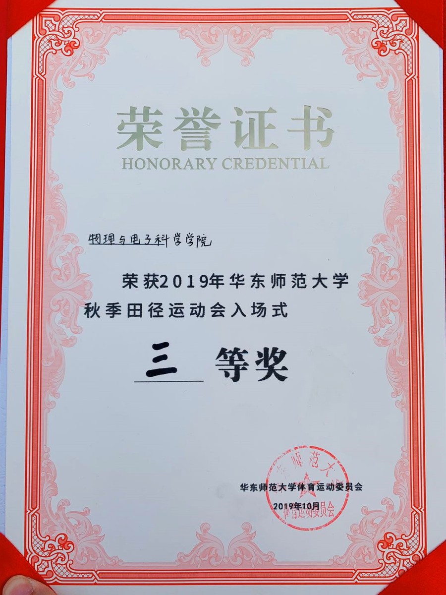 在学生比赛项目中,物理与电子科学学院学生代表队以181分拿下本次校运动会实心球比赛的第一个冠军;孙一辰、胡宇辰同学分别获得男子25米蛙泳第七名、男子50米蛙泳第五名;毛禹浩同学获得引体向上第七名以及男子1000米第八名的成绩,杨剑辉同学获得了男子立定跳远第六名;学院学生代表队获入场式三等奖、学院获得2019年华东师范大学秋季田径运动会优秀组织奖。