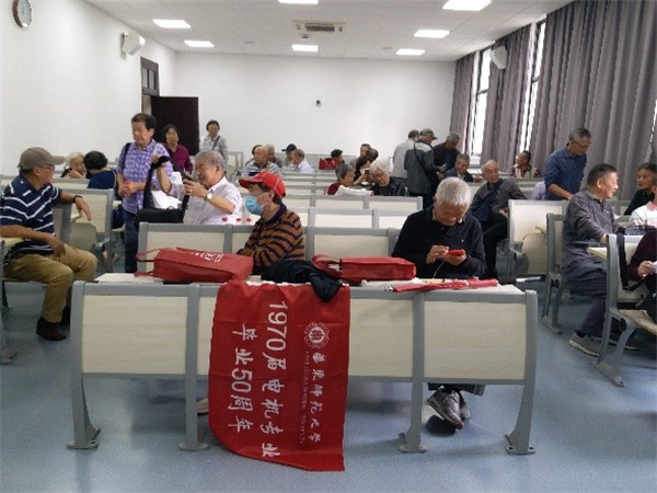 各班级校友联络人领班旗,在校园里与同学、老师们拍照留念。在学校的集中欢迎仪式之后,返校校友来到曾经的教室齐聚一堂,170位1970届校友返校庆祝毕业50周年,回忆青春岁月和点点滴滴。