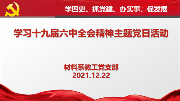 12月22日下午,材料科学系教工党支部在物理楼223会议室集体学习党的第十九届六中全会精神,深刻领会全会精神的丰富内涵和核心要义,活动由支部书记敬承斌主持。