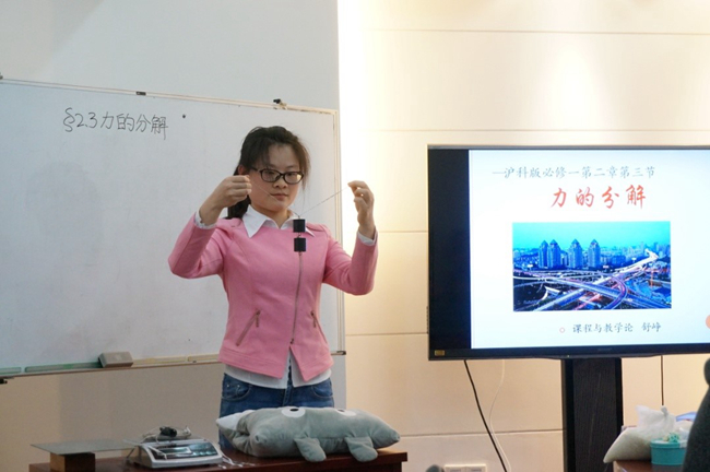 模拟课堂比赛,参赛选手们分别节选中学物理一节内容进行八分钟的现场模拟课堂教学。选手们巧用趣味实验或自制教具引入教学内容,诸如“小球在水 中的浮沉”引发浮力的思考,“如何不触碰小球,让小球跨过障碍”引发向心力的思考,“无线充电技术”引发对自感的思考,激起观众们的学习兴趣。引入正文内 容之后,选手们对于正课内容讲解有条不紊,细致到位,时不时地抛出问题,让“同学们”开动脑筋,积极思考。“老师”与“同学”们在课堂上互动频频,一问一 答,让人仿佛重回中学时光。