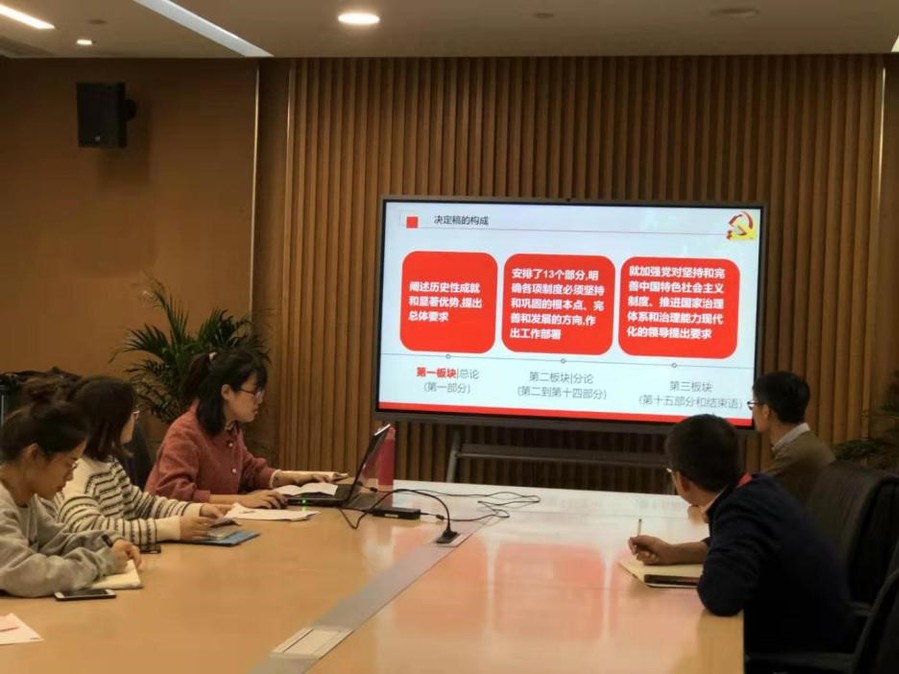 支部书记李军首先对《中共中央关于坚持和完善中国特色社会主义制度、推进国家治理体系和治理能力现代化若干重大问题的决定》中的显著优势、总体目标、重大意义、重点提法等内容进行了解读。她谈到,《决定》深刻回答了“坚持和巩固什么、完善和发展什么”这个重大政治问题,是新时代坚持和完善中国特色社会主义制度、推进国家治理体系和治理能力现代化的政治宣言和行动纲领。