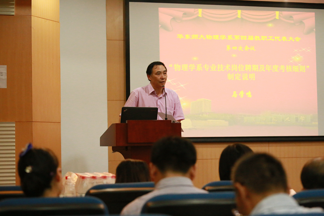 在全体与会代表起立进行奏国歌仪式后,首先由系党委书记马学鸣老师作《物理系专业技术岗位聘期及年度考核细则》制定说明。马老师详细介绍了 最新考核方案出台的来龙去脉,以及相比旧版考核细则的修改情况,特别强调了考核细则关系到物理系的发展和全体教职工的切身利益,希望代表务必加以重视,认真审议。