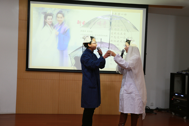 物理学系不乏传统戏剧高手,徐敏与姜继森老师合作的京剧《四郎探母》,尹亚玲老师的京剧《贵妃醉酒》,章继敏老师的越剧《送花楼会》等唱腔老道、字正腔圆、音色优美、韵味十足,让观众听得十分过瘾,不时露出会心的微笑。