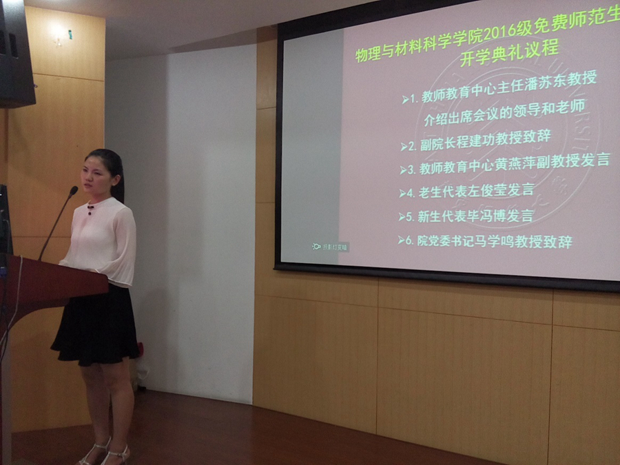 2016年7月17日下午1点,2016级免费师范生教育硕士开学典礼在物理楼226报告厅隆重举行。会议由教育中心主任潘苏东教授主持,院党委书记马学鸣教授、副院长程建功教授、老师教育中心黄燕萍副教授出席会议并致辞。此外,左俊莹同学和毕冯博同学分别代表老生和新生发言。
