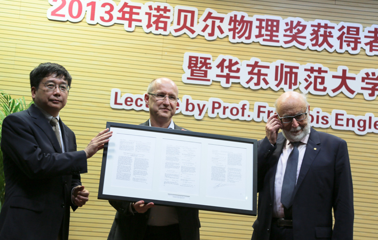 受聘仪式上,恩格勒将他1964年8月31日在《物理评论快报》杂志发表的论文《对称性残破和规范矢量介子的质量》的影印件赠送给华东师大作为特殊礼物。就 是在这篇他与同事罗伯特·布绕特(Robert Brout)合作的论文里,他们提出了希格斯机制与希格斯玻色子理论。