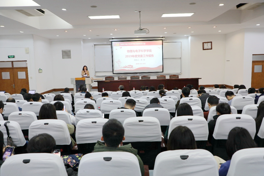 12月24日中午,物理与电子科学学院在闵行校区三教109报告厅召开党员大会,学院党委书记李恺以《坚持党建引领 推进学院发展 为建设一流学科赋能增效》为题,作2019年度学院党委工作报告,大会由学院党委副书记蒋旭主持。学院班子成员、教师党员、退休教师党员代表、学生党员代表参会。