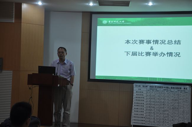 经过2天激烈的角逐,上海交通大学1队、华东师范大学1队、上海交通大学2队凭借各自的出色表现拔得头筹,同济大学、华东理工大学、复旦大学以 及首次参加比赛的上海应用技术学院代表队都在各自的轮赛中有着惊艳的表现。在闭幕式上,本次赛事的倡议人——华东师范大学薛迅老师对各个高校的参与、各高 校指导老师的支持以及各队参赛选手的精彩表演表示了感谢,各个领队对各自队伍的表现进行了评述,均坦言拥有能够与各高校的高手一比高低,并能参加这样一场 淋漓尽致的比赛的机会很珍惜,对明年的上海地区邀请赛充满了期待。最后经过组委会委员的一致评议,由上海市物理学会理事、复旦大学物理学系副主任马世红宣 布下届大学生物理学术精神上海赛区赛事将继续由华东师范大学主办,上海地区各个高校将全力支持此次赛事。华东师范大学物理学系副主任王向晖老师代表华东师 范大学接过了下次比赛的“接力棒”,并承诺会传承此次赛事精神,竭尽全力办好下次赛事。
