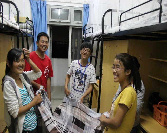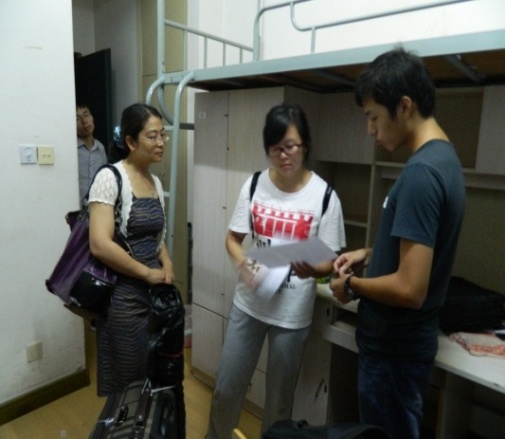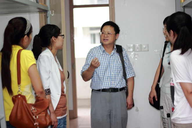 在女生寝室,马老师特别叮嘱她们要注意安全,外出锁门,保管好贵重物品,拒绝一切上门推销,夜间也不要独自外出。此外,马老师还赞扬了女生宿舍的干净整 洁,希望她们共同努力继续保持。在免费师范生寝室,马老师希望所有师范生能够积极参加孟宪承书院组织的活动,寝室里四位同学互相帮助,和谐相处,以教师的 要求在大学让自我成熟、成长。当系领导进入20号楼309寝室时,只见室内一片忙碌的身影,原来是学导正在帮助新生们套被褥,五个人共同配合感动了所有在场的人。马老师赞扬了她们这种团结协作的精神,希望他们将这种精神发扬到今后的学习生活中去。