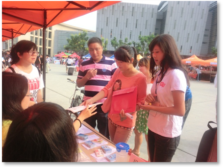 2012年9月8日清晨日初升,一群朝气青年骑着单车,载着满满的期待将早已打包好的报到材料从物理楼运往报到处。顶顶橙红的帐篷散发着新生的力量,更是告诉每一位新同学这里是你梦开始的地方。7点刚过,物理系新生报到处和问讯处就已准备就绪,所有迎新志愿者们也身着物理系统一制服到达指定岗位。在飘扬的物理系系旗下,他们翘首企盼学弟学妹们的到来。分针迈过7点30, 樱桃河畔驶来了第一辆从东川路地铁站接驳新生报到的校车,还没有等车完全停稳,举牌、摇旗、呐喊……学长学姐们释放出积蓄许久的激情,一声声高亢响亮的 “物理系!物理系!物理系的同学来这里!”让新生们着实被这样壮观的场面震撼了。车门缓缓开启,一个挨着一个踏上华东师大的土地,高年级的同学也一个接一 个把车上的行李包裹小心翼翼地送到新生的手中。正当学长学姐们还在猜想今天第一个物理系报到的同学是学弟还是学妹时,一位母亲已领着她文静的女儿找到了物 理系的志愿者。志愿者赶忙帮助一起搬运行李并将她们带往报到处。报到处的学姐第一时间便为她办理了报到手续,同时还将校园卡及“大礼包”(包括一周活动安 排、校园手册、新闻部编撰的《悟理·新生季》、校园卡使用说明、卡套和挂绳)递到她的手中,之后便由志愿者陪同带往寝室。他们在入学的那一刻便感受到物理 系无微不至的关怀。