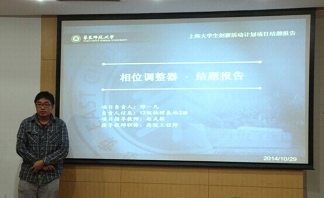 2014年10月,物理学系共有6组项目(包括由邢一凡同学负责的相位调节器、由杨添堡同学负责的锥型激光功率放大器的研制、 由陈浩磊同学负责的电磁场时域间断元基函数研究等)成功通过上海市大学生创新计划项目答辩,有9组项目(包括由陈章章同学负责的激光器频率锁定系统的研 究、由糜珂同学负责的基于微流体技术的氧化锌纳米结构可控合成及其应用研究、由黄珺菁同学负责的氧化锌镓(GZO)薄膜的制备等)通过华东师范大学大夏大 学生创新计划项目答辩。