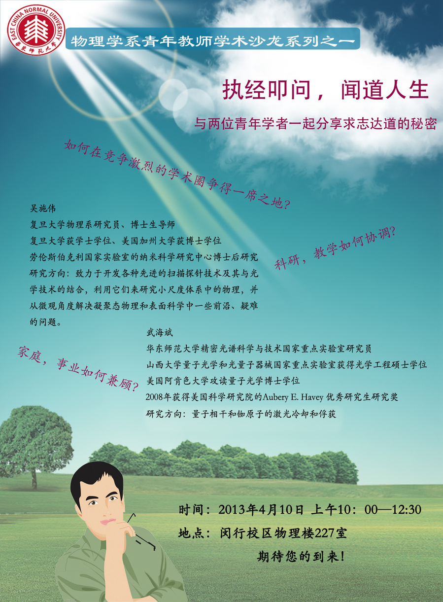 本次活动我们邀请了精密光谱实验室的武海斌研究员,复旦大学物理系吴施伟教授跟我们分享他们的成功经验。活动内容分两大部分,一部分是学术报告,两位外系的老师将从科普的角度简明扼要的介绍各自研究领域、分享科研的心得和体会。同时,我们也邀请了本系青年教师代表介绍自己及所在实验室的研究工作,目的在于增进本系青年教师之间的了解,寻找可能的合作机会。学术报告结束后,我们将和各位老师一起探讨教学科研中可能碰到的各种问题。活动形式轻松愉悦,您可以提出自己在工作中的任何困惑,或者与嘉宾老师及其他青年教师分享自己的经验。
