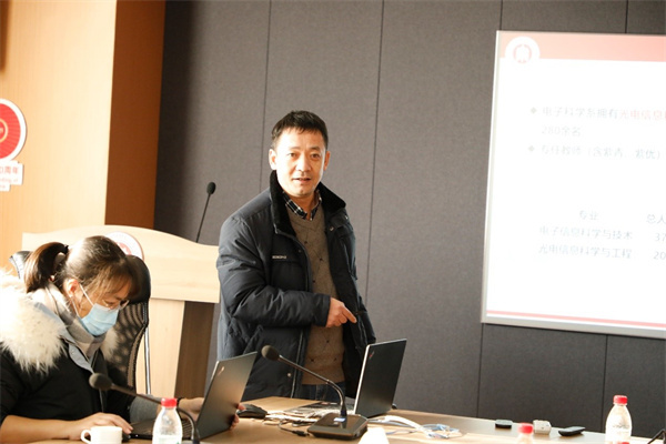 电子科学系副系主任彭晖介绍了光电信息科学与工程、电子信息科学与技术两个专业的发展现状,汇报了2021年度电子系在课程及教材建设、专业建设、双创竞赛等方面取得的突出成果,并分析了目前在教学实验资源、教学经费等方面遇到的困难。