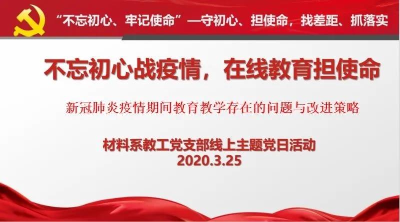 材料科学系教工党支部开展“不忘初心战疫情,在线教育担使命”主题党日活动,围绕在线教学中存在的问题和改进策略等展开讨论。学校研究生教学督导杨平雄同志应邀介绍目前在线教学各平台的使用及反馈情况;王向晖同志作为大学物理教学团队负责人,介绍了大物教学团队线上教学的最初部署、技术支撑和互动评价等情况;本科生班主任欧阳威同志介绍了自己如何召开在线班会,了解所带班级学生在疫情期间的学习和心理情况。支部副书记张哲娟同志分享了远程指导研究生科研、推进线上实验课程建设等经验。
