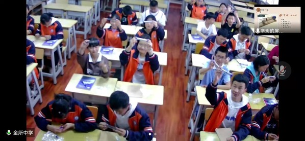 这堂原本应该在闵行校区教学楼里开讲的科普课,最后由宣讲团指导教师黄蕊,金所中学指导教师李坤,学生志愿者辛玥、刘文慧分别在家中、学生宿舍等四个地点配合完成。