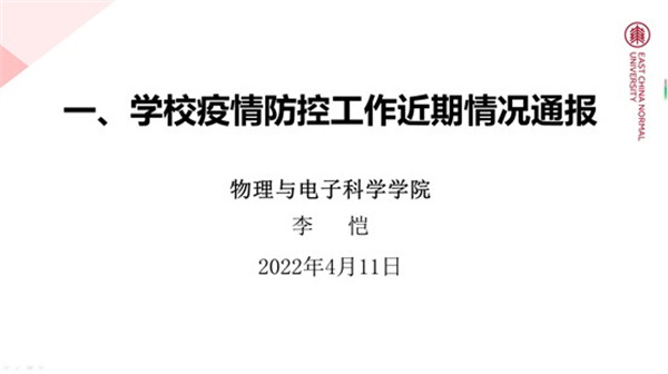 学院党委副书记,精密光谱国重实验室党总支书记、副主任郑利娟对学校疫情防控政策进行了补充,强调了学校疫情防控工作要求,呼吁研究生导师与学生保持密切联系和沟通,提醒学生遵守学校防疫规定,做好个人防护。