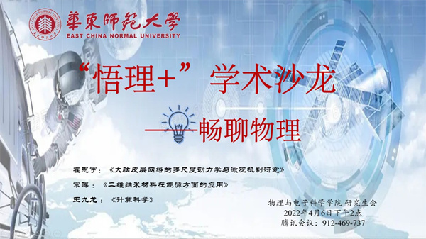 4月6日下午, 由学院研究生会主办的“悟理+”研究生学术沙龙在线举行。2017级理论物理专业研究生霍思宇、2018级物理电子学研究生宗晖和2019级物理电子学专业研究生王九龙分别作主题分享,学院研究生会指导老师黄蕊参加。