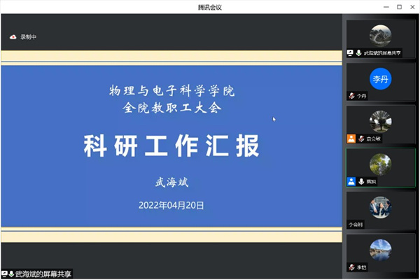 4月20日下午,物理与电子科学学院在线召开四月份全院教职工大会暨毕业就业工作专题推进会,学院各系所、二级学科负责人分别就各单位毕业就业情况和下阶段推进举措作汇报,全院200余名教职工线上参会。会议由学院党委书记李恺主持,班子成员分别通报近期重点工作。