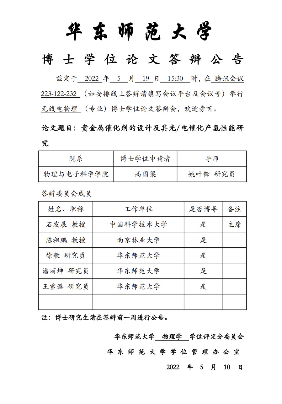 华东师范大学 博士学位论文答辩公告-高国梁