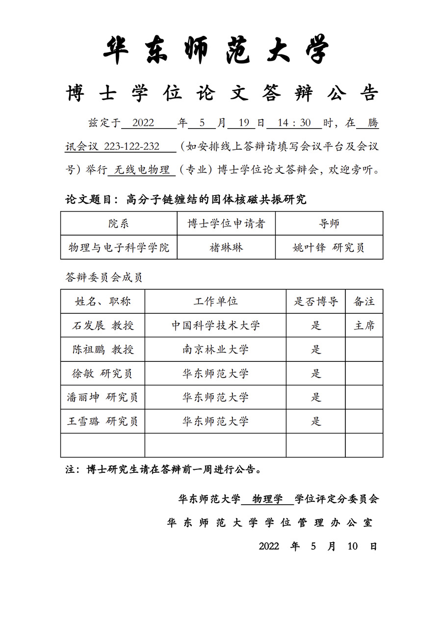 华东师范大学 博士学位论文答辩公告-褚琳琳