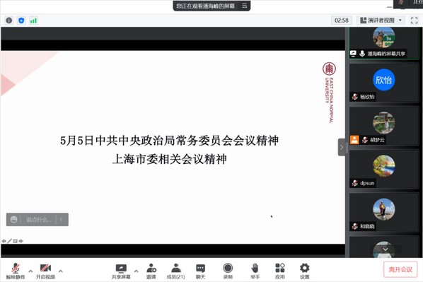 根据校党委组织部和学院党委相关要求,自5月8日起,各基层党支部纷纷开展支部研学,物理学系教工党支部、物理实验中心教工党支部、精密光谱国重实验室教工第一党支部、精密光谱国重实验室教工第二党支部、2020级研究生第二党支部、2020级研究生第一党支部、精密光谱国重实验室2021级研究生第一党支部、精密光谱国重实验室2020级研究生党支部等师生党支部分别开展多种形式的线上学习交流。物理学系教工党支部就学校疫情防控情况以及在线教学情况进行了交流讨论;精密光谱国重实验室教工第一党支部邀请留守校园抗疫和居家抗疫的党员同志结合会议精神,分享抗疫故事和感悟。