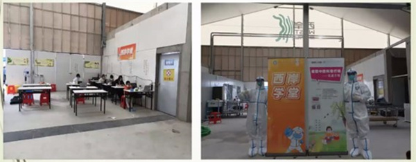 张楷乐谈到,本轮疫情来势凶猛,由于奥密克戎病毒的高传染性,医护感染风险加大,面对未知的恐惧,以及对方舱环境、医患关系的顾虑,医护人员无论从体力还是心理上都面临着极大的挑战。医疗队党员冲锋在前、主动扛责,组建方舱临时党支部、团支部,做好组织动员工作,不断摸索、反思、总结经验。为丰富舱内生活,医疗队党员们在做好医疗保障的同时,充分发挥科室特长,在舱内开展个性化医疗服务,如中医针灸,赠送中药香囊,带练五禽戏、八段锦等健身操。同时,还在方舱一角开设了“西岸学堂”,保障舱内中小学生的学习生活。方舱简陋的墙面上,医疗队的党员和团员用自己的书画作品做装饰,丰富精神生活,鼓舞抗疫斗志。