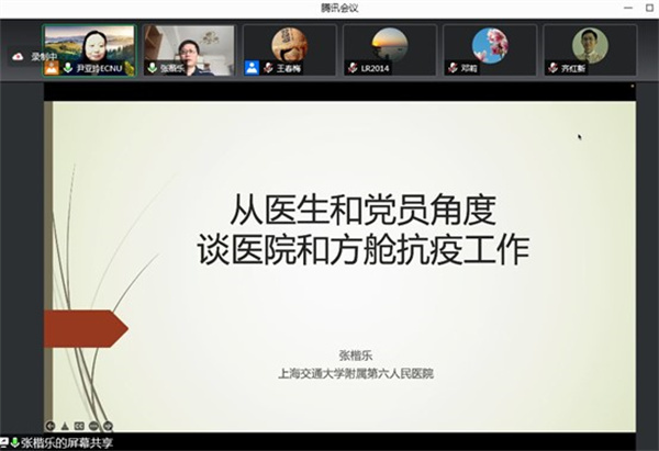 为引导师生党员科学防控、积极应对,坚定打赢大上海保卫战,5月25日下午,物理实验教学中心教工党支部组织开展了多支部联合学习活动,上海交通大学附属第六人民医院主治医师张楷乐受邀作主题报告,学院行政党支部、物理学系教工党支部、材料科学系教工党支部,电子科学系党教工党支部,精密光谱国重实验室教工第一党支部、第二党支部等共90余名党员线上参会,会议由物理实验教学中心教工党支部书记尹亚玲主持。