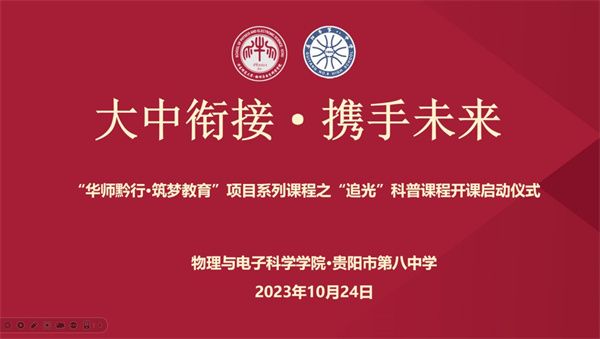 10月24日下午,物理与电子科学学院依托“追光”科普宣讲团,面向贵阳八中开设第一期“追光”科普课程,共建“追光”科普社团,贵阳八中高一至高二,共22个班级,约1000多名学生在线参加。