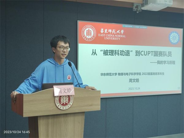周文皓以“从被理科劝退到CUPT国赛队员”为题,分享了自己的学习经历,他谈到,“不要被任何人定义”,要付出真正的努力,才能得到真正的收获。