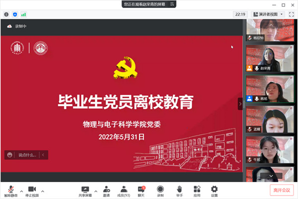 5月31日,学院党委组织开展毕业生党员离校教育,教育部高校思想政治工作队伍培训研修中心副主任张俊华受邀作主题报告,学院党委书记李恺,毕业生辅导员聂树伟、王元力、杨欣怡,专职组织员赵荣青及100余位学院毕业生党员线上参会,活动由学院党委副书记蒋旭主持。