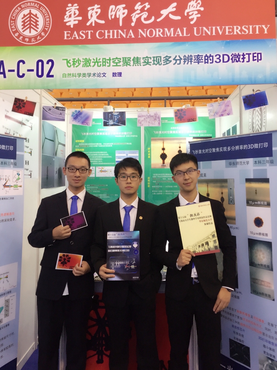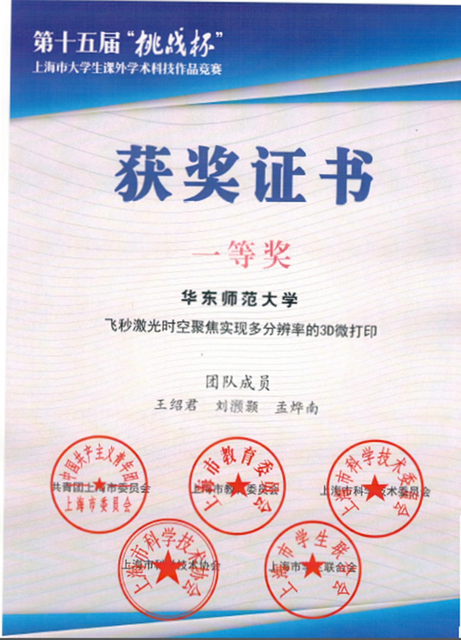 2017年6月10日,第十五届“挑战杯”上海市大学生课外学术科技作品竞赛在上海科技大学体育馆隆重举行,据统计,本次赛事共有40余所高校近百个项目参与,我院本科生团队项目《飞秒激光时空聚焦实现多分辨率的3D微打印》从中脱颖而出,勇创佳绩,获得一等奖,晋级全国总决赛。该项目团队成员为2014级本科生王绍君、孟烨南、刘滪颢,指导教师为我院院长程亚教授。