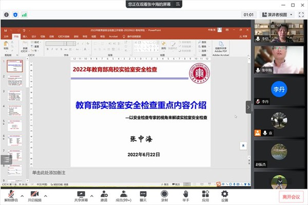 6月22日下午,物理与电子科学学院在线召开全院教职工大会暨2022年教育部实验室安全检查专题推进会,化学与分子工程学院副院长张中海应邀作主题报告。大会由学院党委书记李恺主持,260余名教职工线上参会。