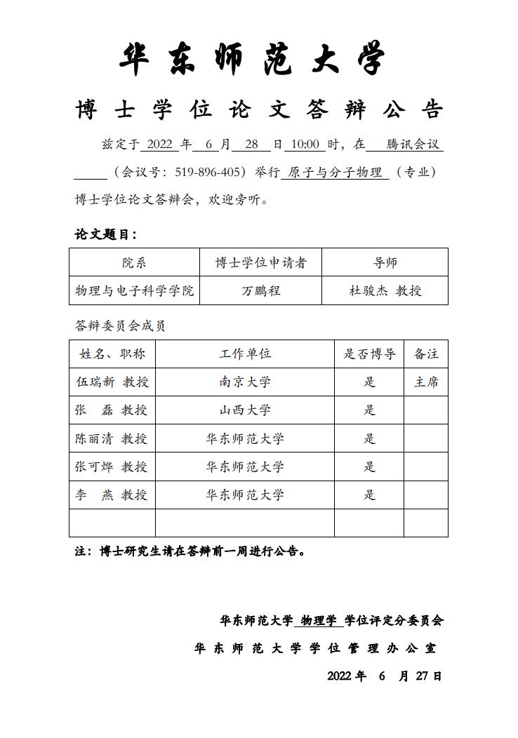 华东师范大学 博士学位论文答辩公告-万鹏程