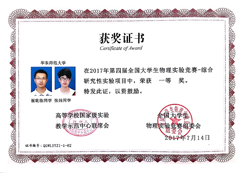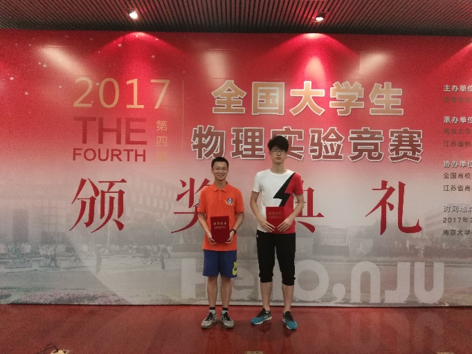 2017年7月12日,由高等学校国家级实验教学示范中心联席会主办,全国高校实验物理教学研究会和江苏省高校实验室研究会协办,南京大学乐鱼(中国)一站式服务平台和江苏省物理学会承办的第四届全国大学生物理实验竞赛在南京大学仙林校区举行。经过两天的激烈角逐,我院14级本科生崔乾临与张炜同学获综合研究性实验项目一等奖,15级本科生石佳辰同学获基础性实验项目二等奖,15级本科生戴羽同学获基础性实验项目的入围奖。