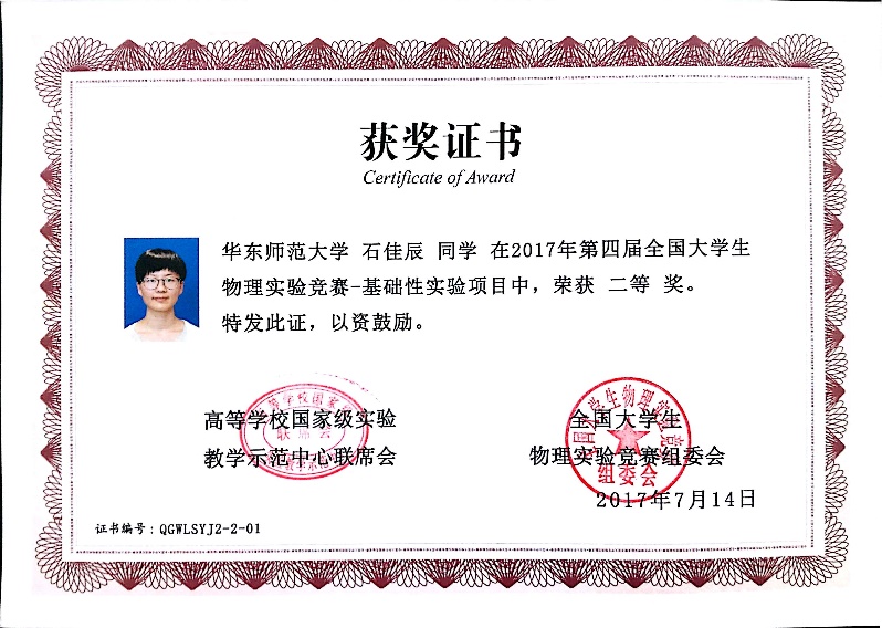 15级本科生石佳辰同学获基础性实验项目二等奖