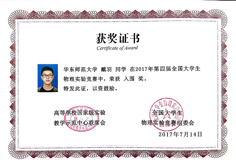 15级本科生戴羽同学获基础性实验项目中获入围奖