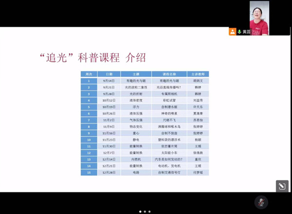 黄蕊对“追光”科普训练营第二期的课程安排进行了介绍,本期课程紧跟科学前沿知识,基于初中物理课程,涵盖光学、磁学、电学、力学、气液压强、能量转换等15个主题,在传授基本物理规律和知识的同时,能够拓展学生物理知识储备,激发学生物理学习的思维。