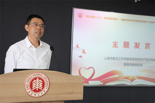 为更好展现我院教师爱国奋斗、立德树人的精神风貌,引导青年教师坚守教育报国初心,勇担筑梦育人使命,9月15日下午,物理与电子科学学院在闵行校区物理楼三楼多功能厅举办“奋进迎接二十大培根铸魂育新人”庆祝第38个教师节主题座谈会。学院党政班子成员、工会主席、新聘专业班主任、新入职教师等参会。会议由学院党委副书记蒋旭主持。