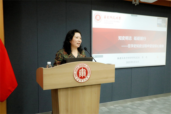 为更好地发挥校史院史的育人功能,李恺以华东师大物理学科发展史中涌现的优秀共产党员,如乔登江院士、袁运开教授、夏慧荣教授、马龙生教授等为例,讲述了学科发展史中的奋斗故事。她嘱托新生党员,身处新时代、眺望新征程,应该清楚地认识到“我们从哪里来”“我们到哪里去”。要结合自身学习研究的工作实际、成长成才的目标,认真学习党史、校史、院史和学科发展史,真正做到学史明理、学史增信、学史崇德、学史力行,从历史中汲取砥砺前行的不竭动力。