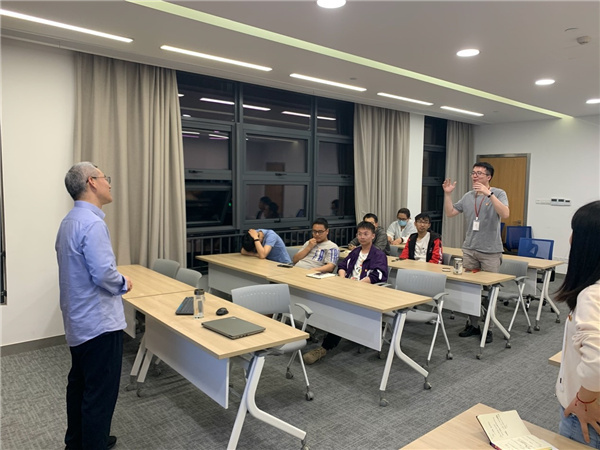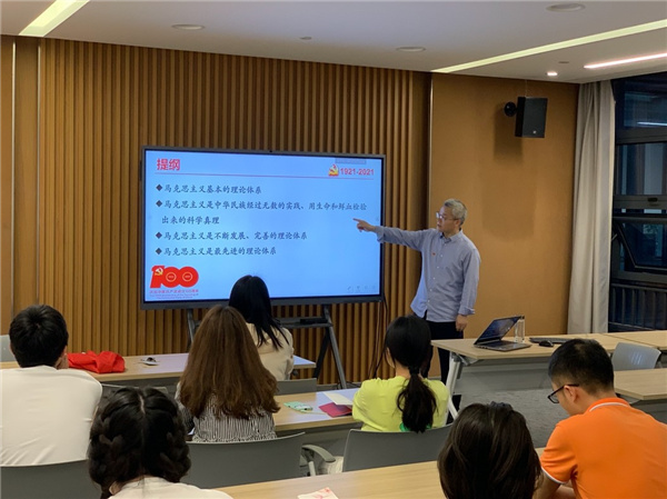 贾天卿以物理专业中焦耳定律、量子力学的发现历程为引,引导学生党员们理解马克思主义是由中华民族经过无数的实践、用生命和鲜血检验出来的科学真理。他结合大量史实资料,着重讲述了马克思主义中国化的两次重大发展,即毛泽东思想和中国特色社会主义,并通过与资本主义社会的对比,充分展现了马克思主义理论体系的先进性。
