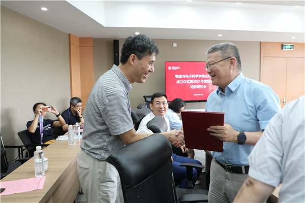 7月13日,物理与电子科学学院“名师工作室”成立仪式暨2021年拔尖人才培养研讨会在物理楼三楼多功能厅举行。汕头大学副校长陈敏教授、北京大学刘玉鑫教授、吉林大学张汉壮教授、南京大学吴小山教授、上海交通大学胡其图教授、复旦大学教务处处长蒋最敏教授、南开大学刘玉斌教授、同济大学张建卫教授,我校教务处处长孟钟捷教授、副处长周先荣教授,学院院长程亚教授,学院党委副书记、精密光谱科学与技术国家重点实验室主任兼党总支书记吴健教授,学院挂职副院长路俊哲副教授等50余名校内外专家现场参会。山西大学贾锁堂教授、清华大学阮东教授及相关教师线上参会。会议由学院副院长徐敏、物理专业责任教授刘宗华共同主持。
