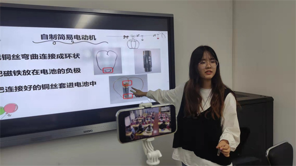 在同学们的好奇与喜悦中,王媛解释了简易电动机背后的原理,同时针对部分同学实验失败的情况,王媛解读了可能存在的原因,拓展了同学们的认知。