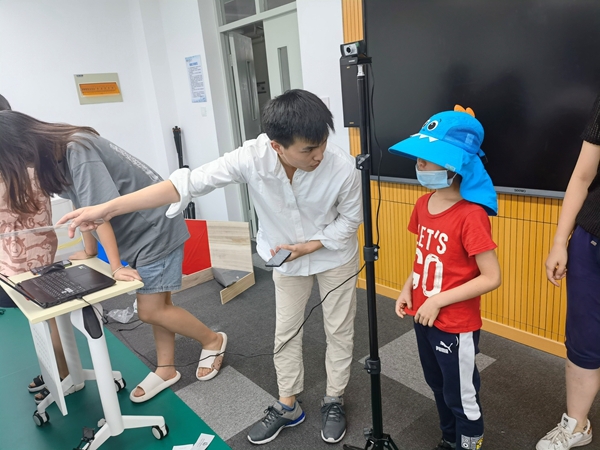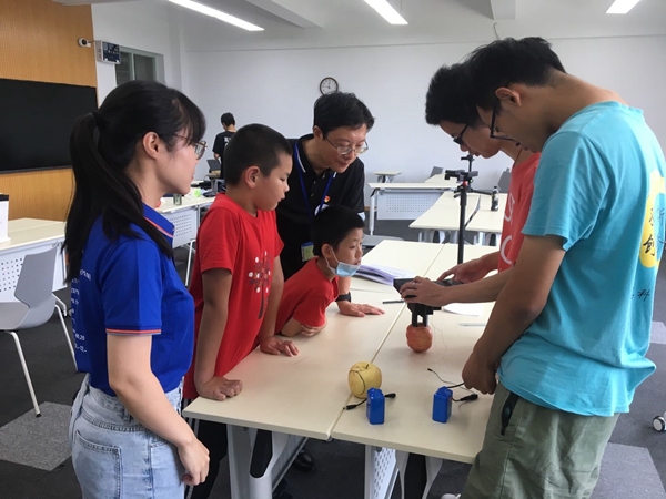 在赛事举办过程中,根据疫情防控需要,学院党委暂停了“追光”亲子科普活动,但仍有少数校内教师等携“小科技迷”慕名而来,“追光”党员先锋服务队在电子科学系教工党支部书记黄荣、学院专职组织员赵荣青的带领和对接下,一对一为小朋友开展科普讲解。