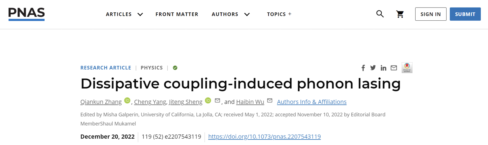 华东师范大学精密光谱科学与技术国家重点实验室武海斌教授的研究团队首次实现纯耗散耦合诱导的声子激光。这是一种反直觉的产生声子激光的新方法,普通激光由相干产生增益放大,这里新的机制是由耗散耦合系统通过非厄米的相变产生,具有新奇的相跃迁和关联特性,对研究基于非厄米的微纳体系的非平衡热力学和精密测量有重要意义。该研究成果于2022年12月20日以“Dissipative coupling-induced phonon lasing”为题发表于《美国科学院院刊》(PNAS)。华东师范大学为论文的完成单位,博士研究生张乾坤为该工作第一作者,盛继腾研究员和武海斌教授为论文的通讯作者。
