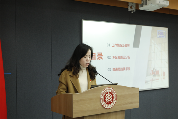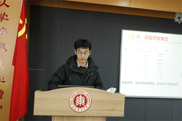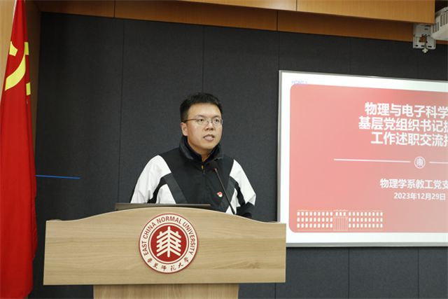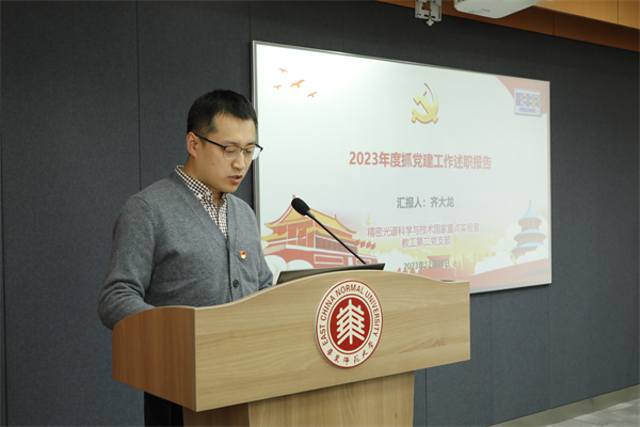 随后,精密光谱科学与技术国家重点实验室党总支书记郑利娟、精密光谱科学与技术国家重点实验室教工第二党支部书记齐大龙、物理学系教工党支部书记杨洋、磁共振实验室教工党支部书记王雪璐、精密光谱科学与技术国家重点实验室研究生第一党支部书记闻齐、精密光谱科学与技术国家重点实验室研究生第六党支部朱琦琦、理论物理研究生党支部书记陆正强、电子研究生党支部书记张玲玲分别作为师生党支部书记代表进行述职,学院党委委员逐一点评。