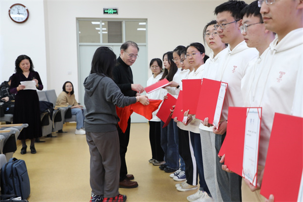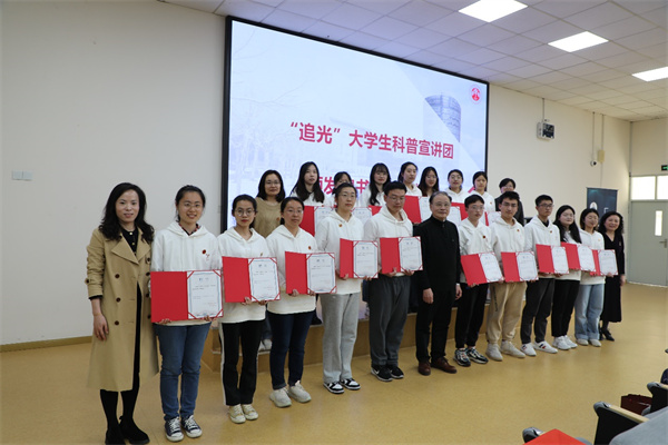 为勉励学院“追光”大学生科普宣讲团师生继续立足学科优势、弘扬科学家精神、助力乡村振兴,讲座结束后,褚院士为宣讲团志愿者颁发证书并佩戴徽章。