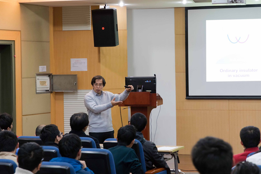 报告中,陈曦教授以其丰富的学识、饱满的热情向同学们介绍凝聚态物理中拓扑性的起源以及凝聚态物理中发现的如拓扑绝缘体等拓扑态。拓扑绝缘体是一类由自旋-轨道耦合效应导致的新奇量子物态,它具有类似于绝缘体的能隙,而在其表面存在无能隙的金属态,这种表面态来源于体能带的拓扑结构,受时间反演对称性保护。