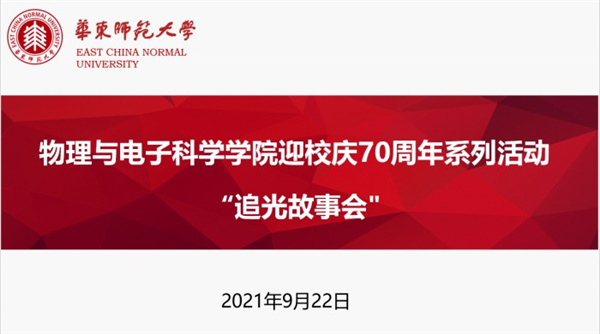 为迎接学校70周年校庆,传承物理精神、推进三全育人,9月22日下午,学院迎校庆70周年系列活动之“追光故事会”在闵行校区物理楼三楼多功能厅举行,物理系59级校友杨燮龙,80级双语试点班校友、上海胶基食品有限公司原物料部经理、级刊《独墅湖畔》主编韩王荣,原物理系副系主任徐力平为同学们分享成长故事,活动由学院党委书记助理、团委书记王元力主持。