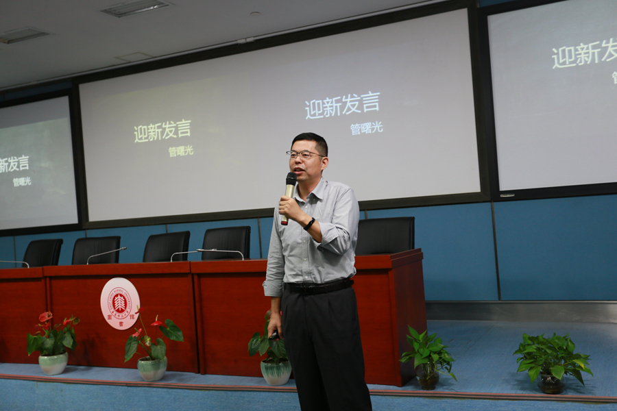 然后是学院教师代表管曙光教授发言。他对新同学提出了三点的殷切希望:一是希望大家要有目标并为之奋斗;二是要有充分的自信,在不断琢磨中突破自我,进而达到满意结果;三是叮嘱同学们一个人的心有多大,舞台就有多大,要不断超越自我。