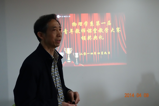 2014年4月9日中午12:00,物理学系第一届青年教师课堂教学大赛颁奖典礼于物理楼227活动室拉开帷幕。物理学系党委书记马学鸣,系副主任王向晖、徐敏,副书记马红梅,工会主席姜继森等老师,以及校教学督导、原物理学系教授朱鋐雄、宦强等老师莅临参与并颁奖。